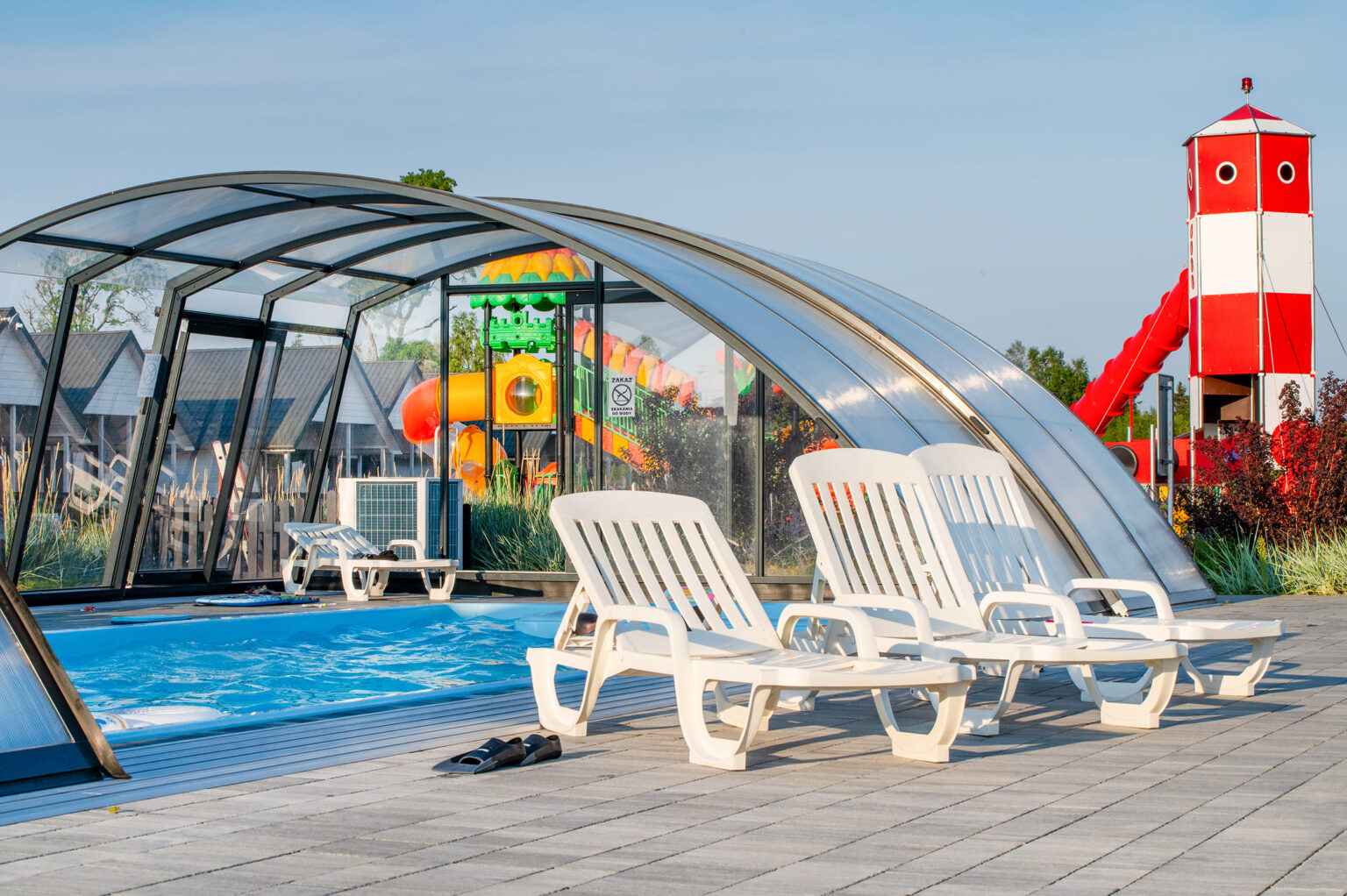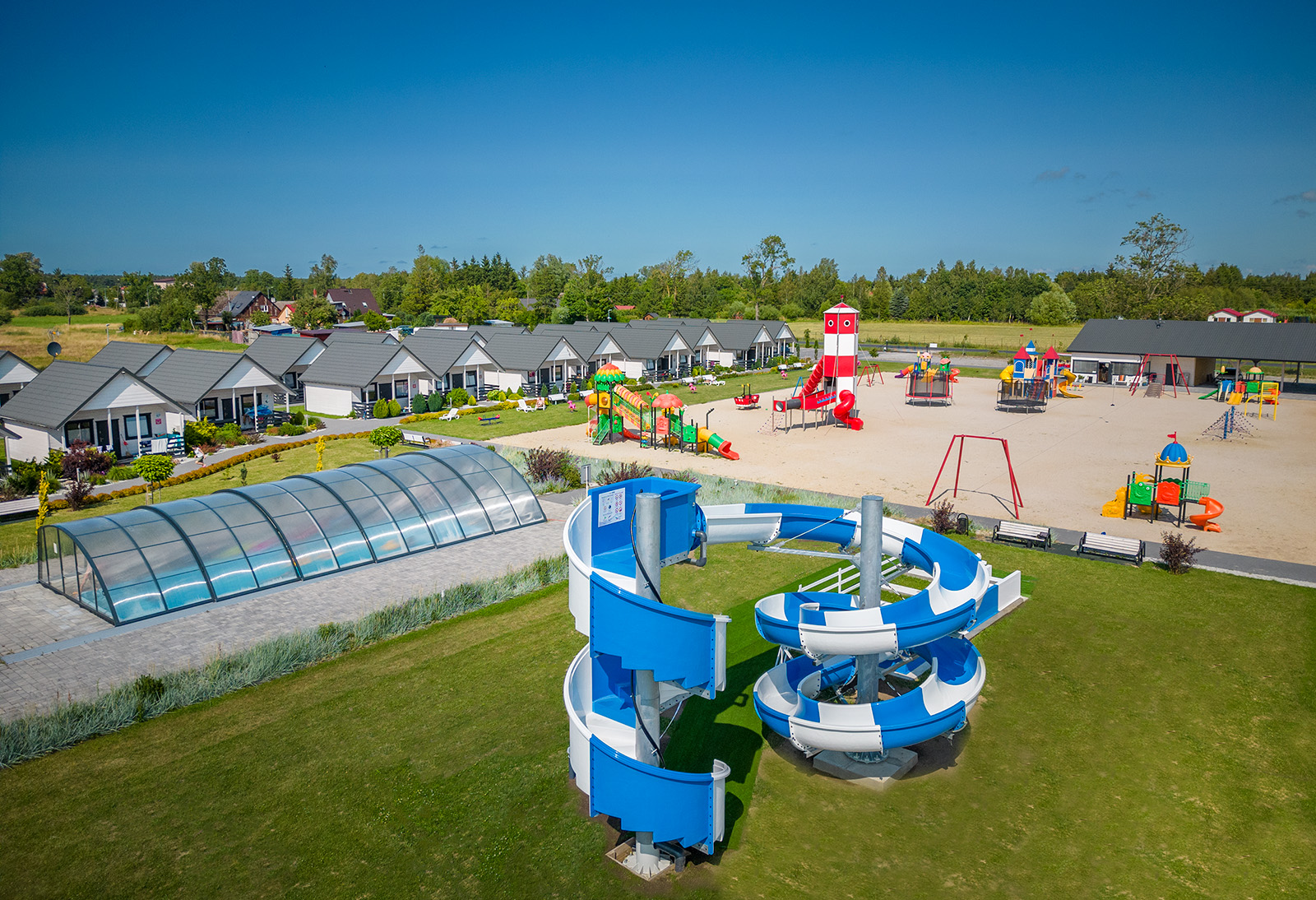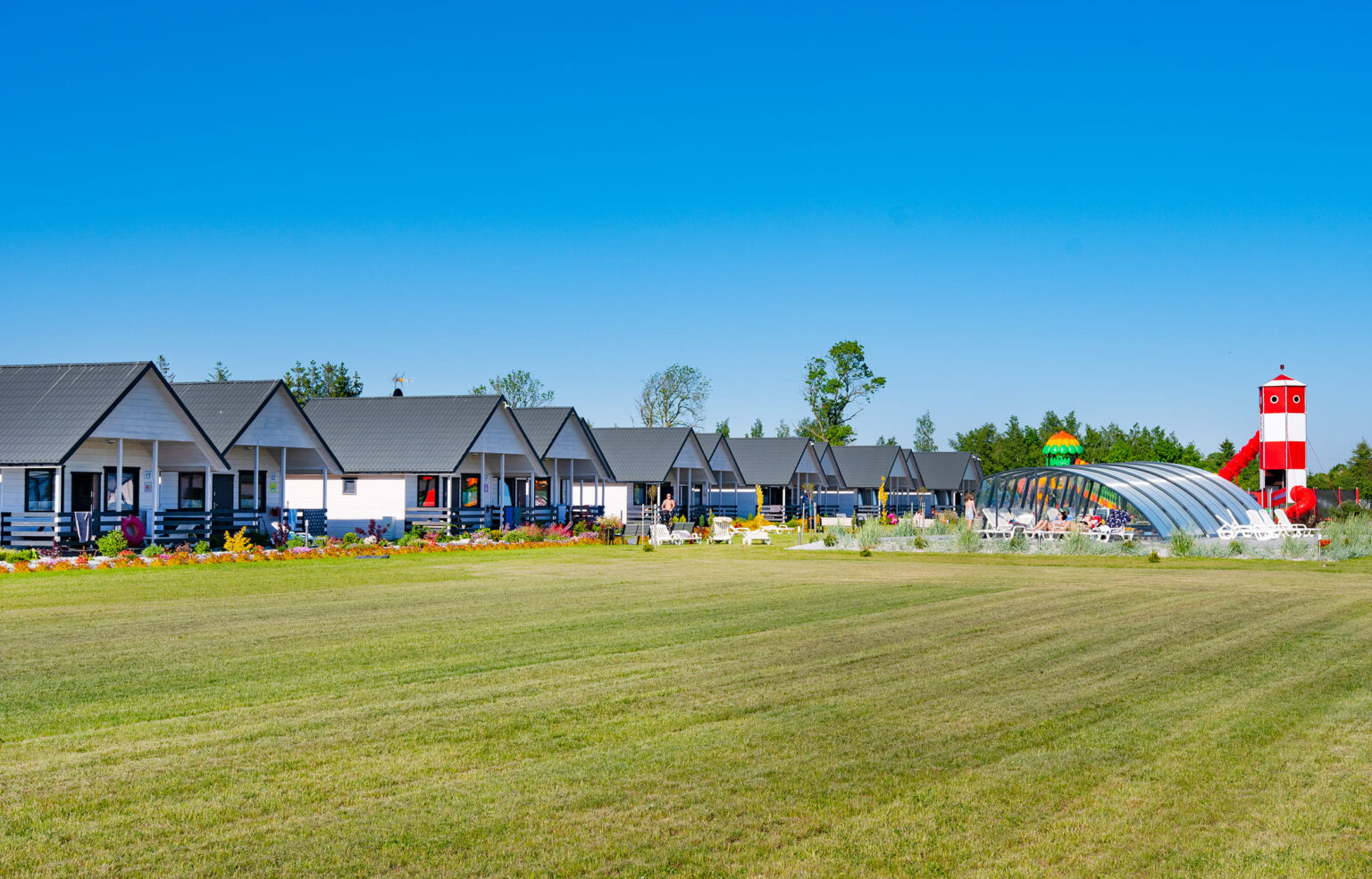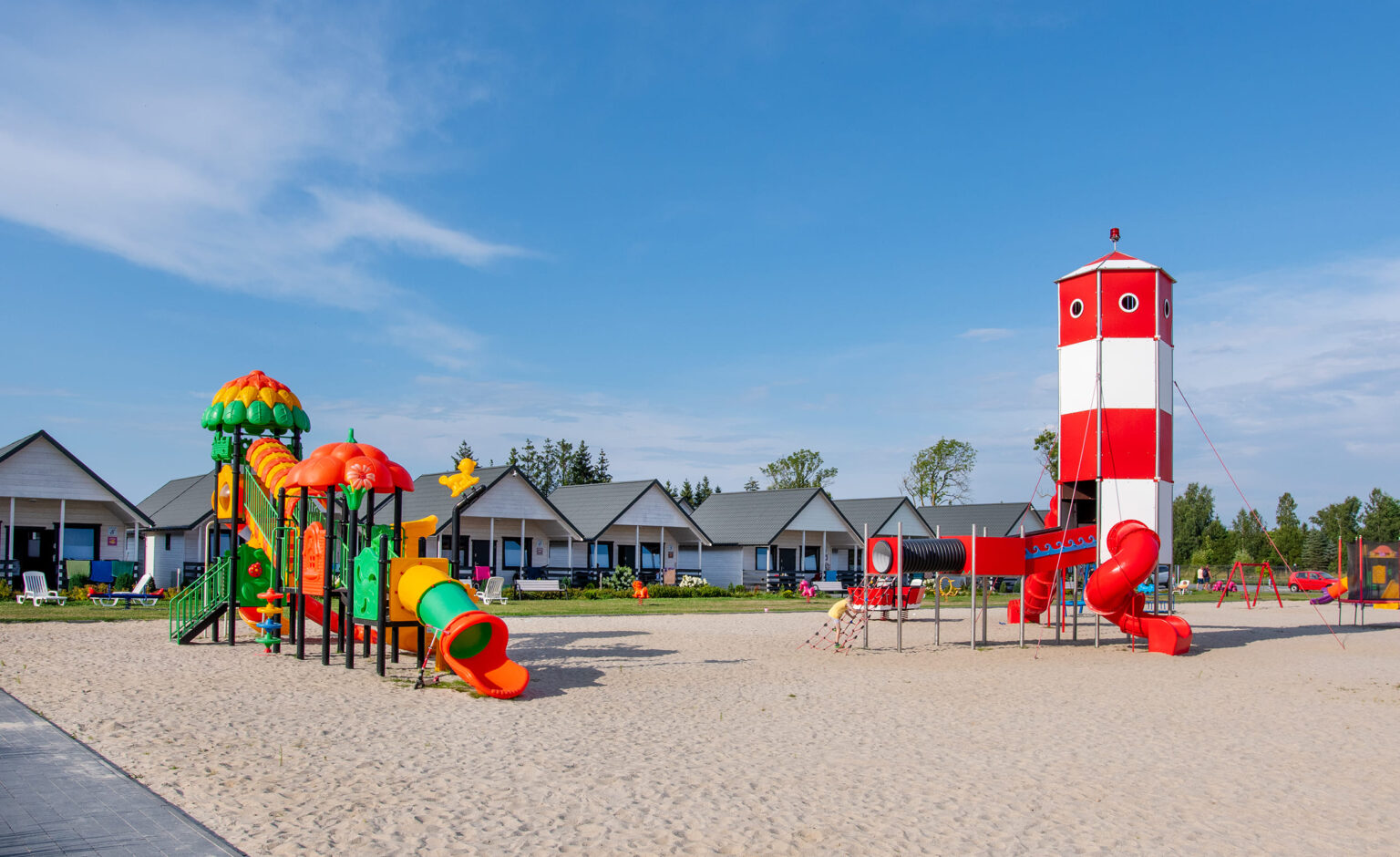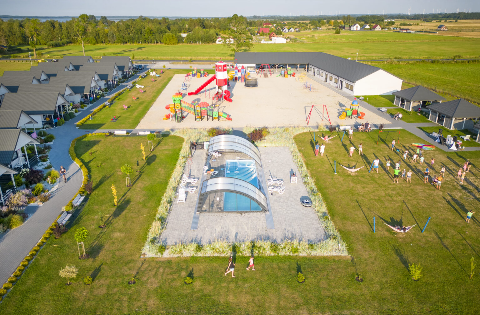 W malowniczych, nadmorskich okolicach Jarosławca stworzyliśmy wyjątkowe miejsce wypoczynku dla rodzin z dziećmi. Na rozległej trzyhektarowej działce z domkami czekają na Was atrakcje dla dużych i małych: letni basen z podgrzewaną wodą, zjeżdżalnia wodna, olbrzymi plac zabaw, boiska sportowe, małpi gaj, gry zręcznościowe. Letni program animacji skutecznie umila wolny czas po plażowaniu.